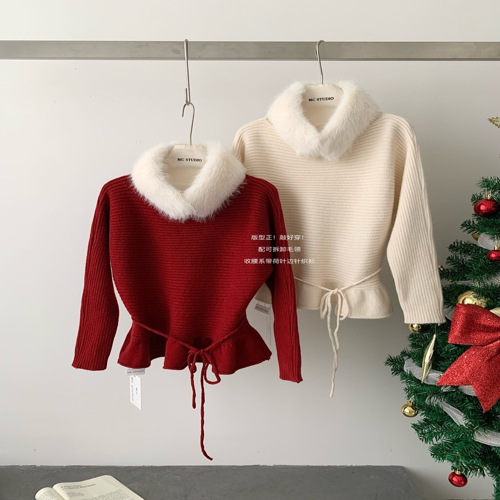• 제품명: 탈부착 퍼 카라 허리끈 페플럼 니트
