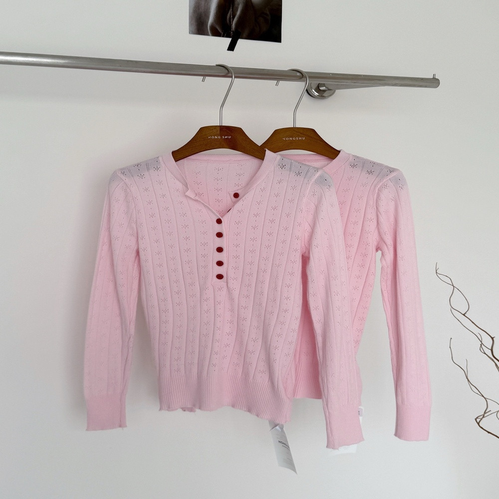 • 제품명: 핑크 헨리넥 레드버튼 케이블 니트