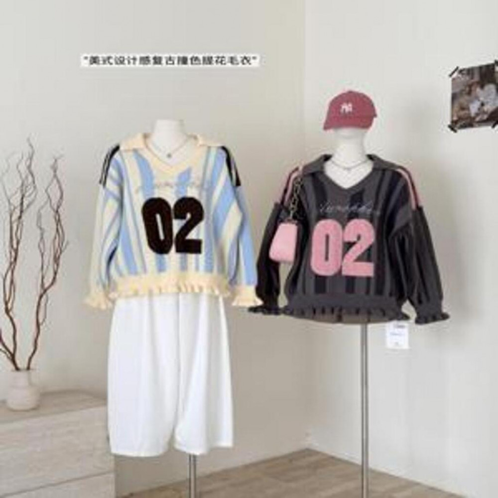 • 배색 스트라이프와 숫자 자카드 디자인으로 빈티지한 무드 강조