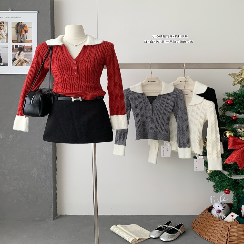 • 제품명: 배색 퍼 트리밍 브이넥 꽈배기 니트