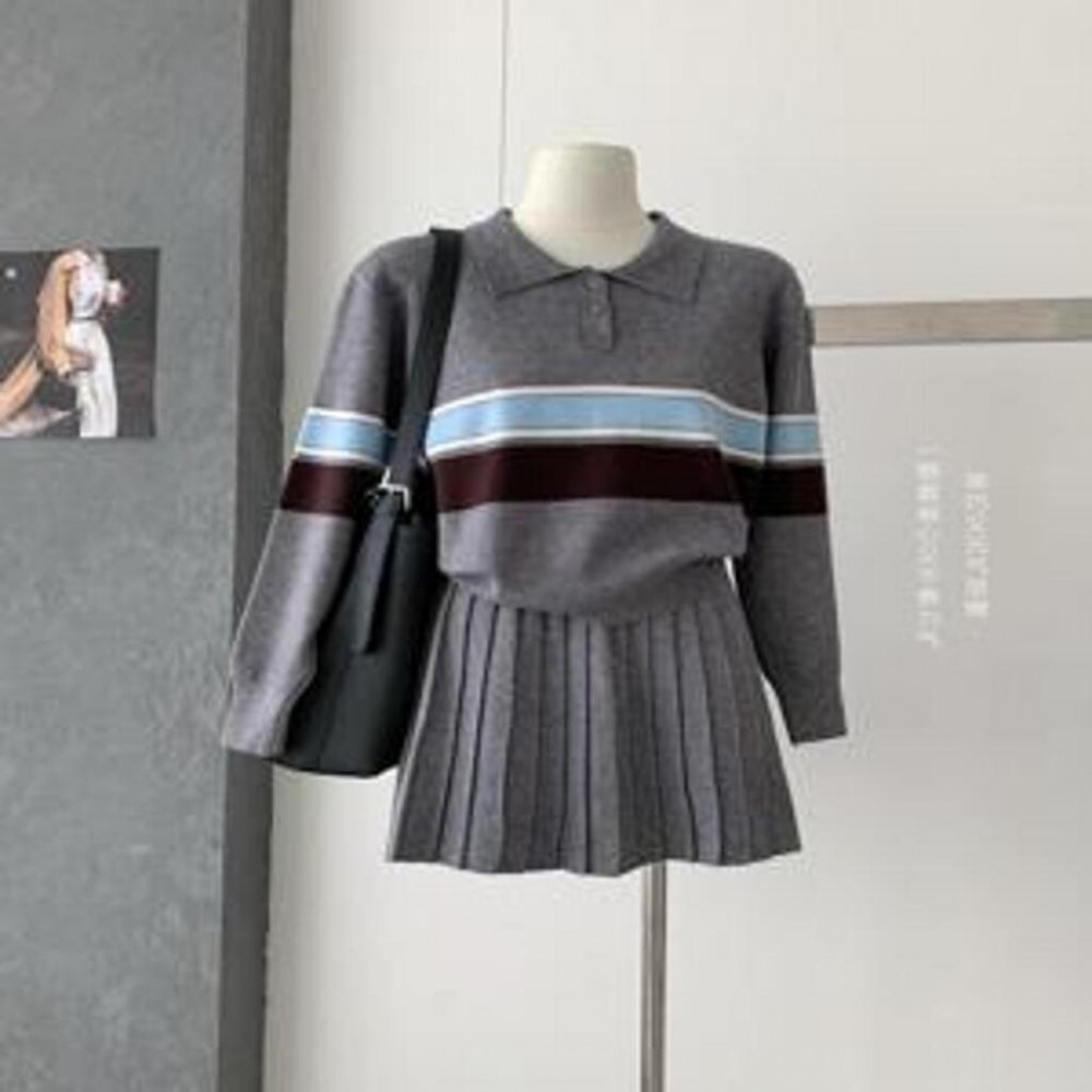 • 폴로넥 디자인의 니트 상의와 플리츠 스커트 세트 구성